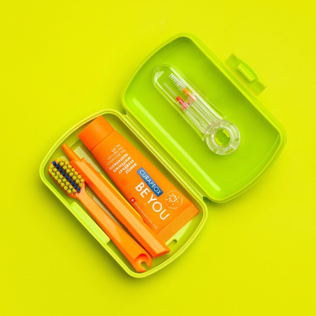 Svaki set sadrži rasklopivu četkicu za zube, Be you pastu od 10 ml (dovoljnu za 10 dana korišćenja), i dve interdentalne četkice. Za one sa fiksnim ortodontskim aparatom, tu su specijalni setovi sa tri različite interdentalne četkice. Sve dolazi u praktičnom pakovanju dimenzija 9,5 x 6 cm – lako staje u svaki džep ili torbicu!
