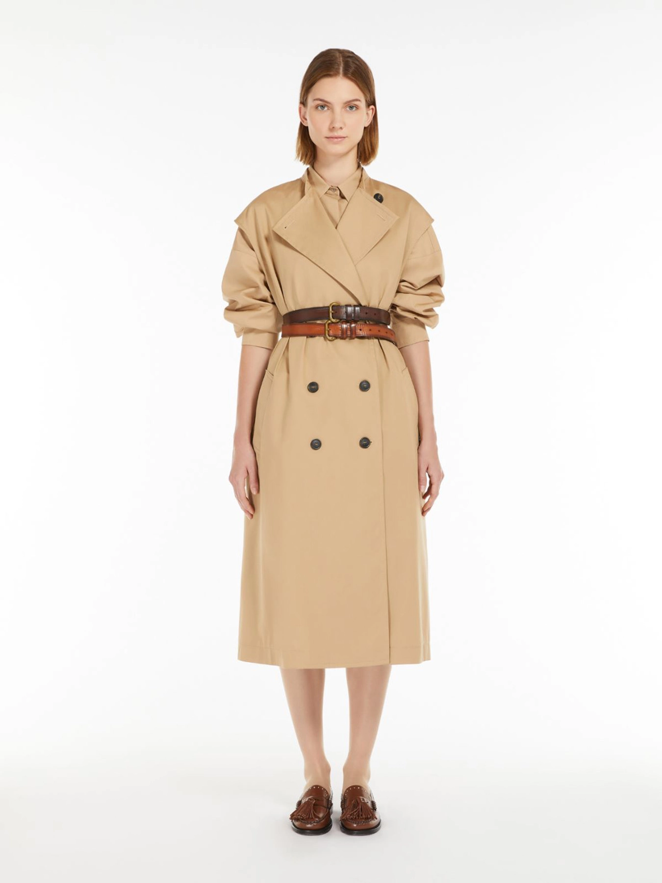 Mantil od pamučnog impregniranog gabardina osmišljen je tako da se nosi na više načina, prilagođavajući se različitim prilikama i stilovima. Dodaje dozu elegancije svakodnevnim kombinacijama, dok kaiš sa kožnom šnalom naglašava struk i daje ženstvenu siluetu.