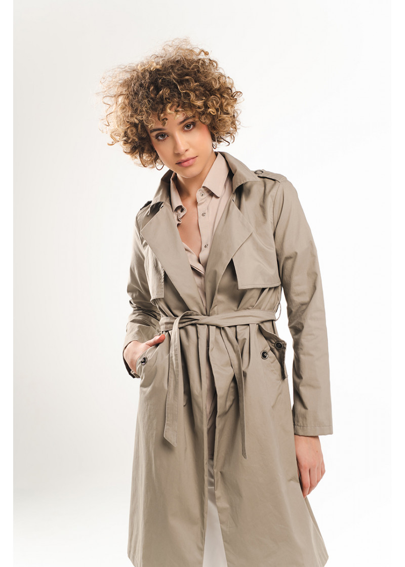 Trench mantil sa kragnom, reverima i dugim rukavima koji se podešavaju uz pomoć traka. Džepovi sa prednje strane daju mu dodatnu funkcionalnnosti, a kaiš od istog materijala izražava siluetu. Možete da ga nosite kako uz suknje, tako i uz pantalone, a nijansa je idealna za kombinovanje sa različitim zemljanim nijansama.