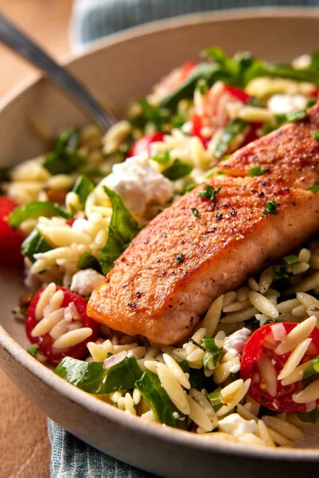 Ovaj recept uključuje blago začinjeni losos sa domaćom salatom od orza koja je jednostavno preukusna.