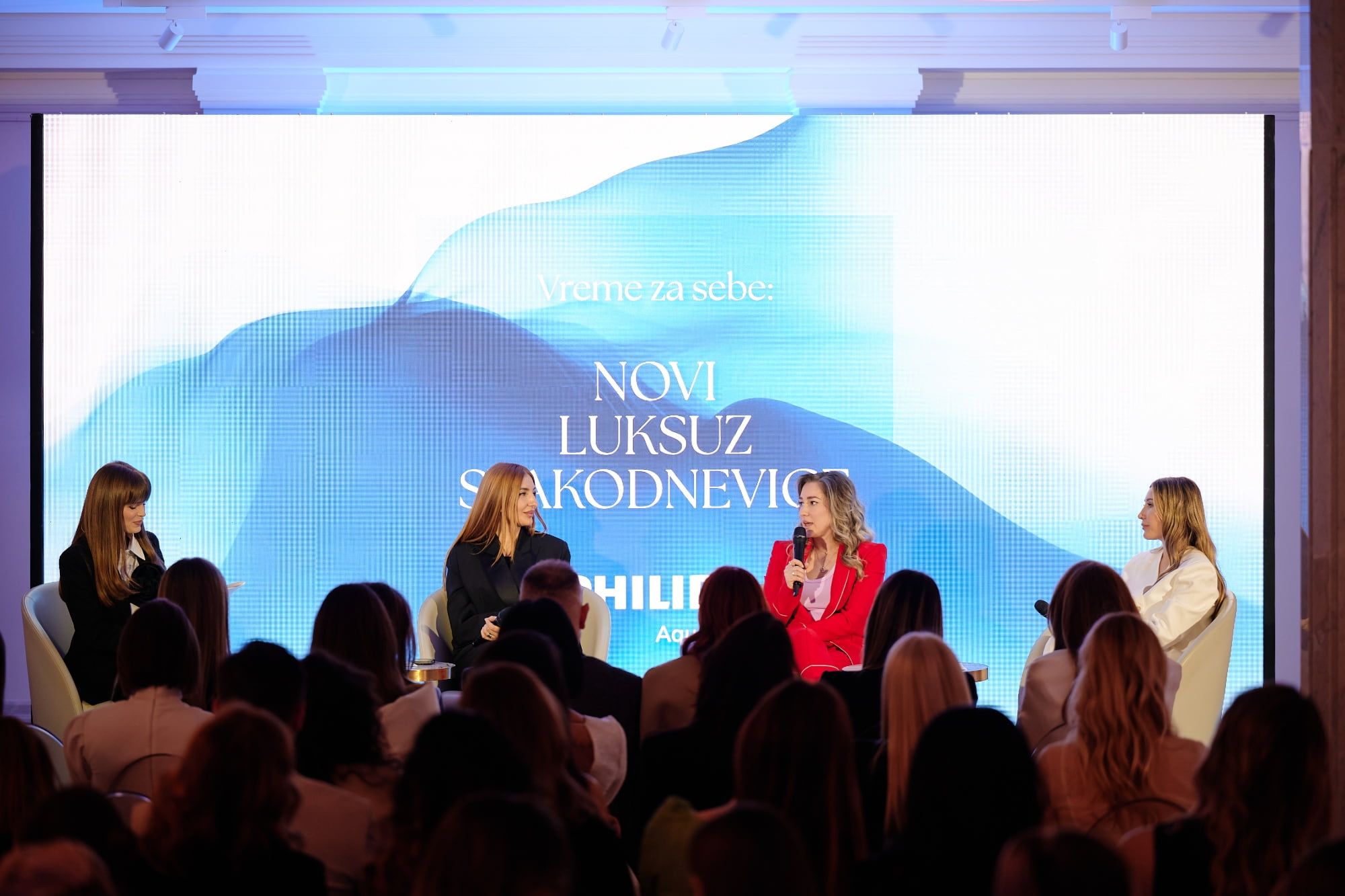Centralni deo večeri bio je panel „Vreme za sebe: Novi luksuz svakodnevice“, u wellbeing-first tonu, sa fokusom na realne primere i praktične mini-savete, bez narativa “još jedna stvar koju moraš”. Panel je moderirala Jovana Arsić, a u razgovoru su učestvovale Hana Rukavina (Versuni Philips Domestic appliances), Sonja Đurović (psihoterapeutkinja) i Jelena Protić (arhitekta i osnivačica Izba studija).